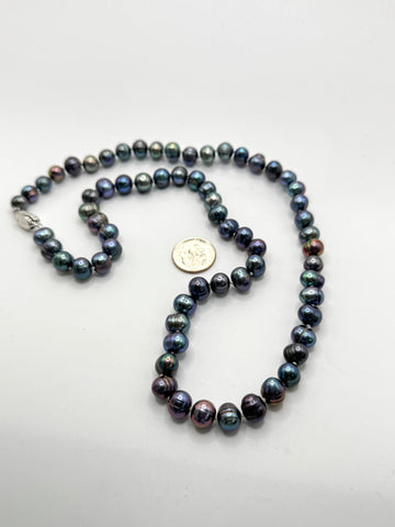 22 inch medium sized baroque freshwater pearl necklace. Blue (7-9mm) pearls. Sterling silver security closure. These are set size 22 inch, they cannot be custom ordered.