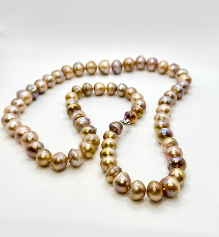 32 inch Apricot Edison pearl necklace. Large 10-14mm baroque pearls. Gorgeous and unique irregularly shaped, all natural color. Sterling silver security snap clasp.